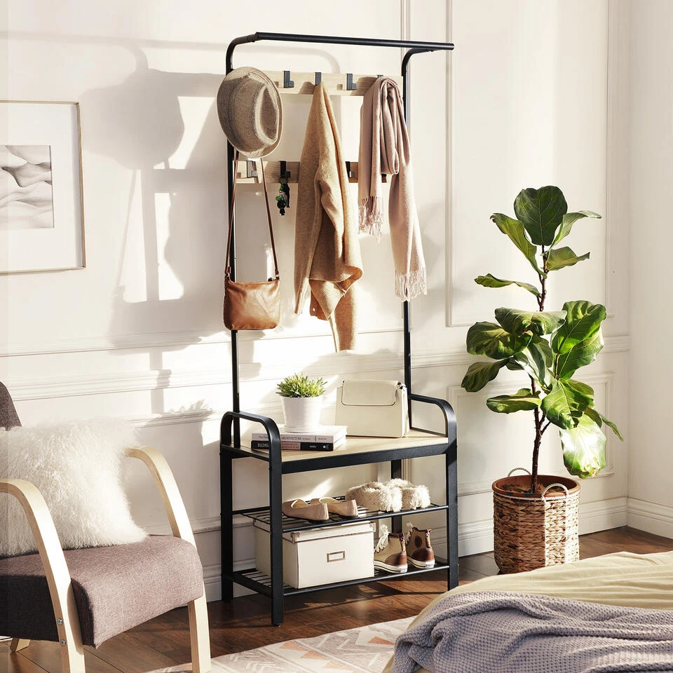huis. Dit elegante meubel kan immers gebruikt worden als kapstok, schoenenrek én bankje.
