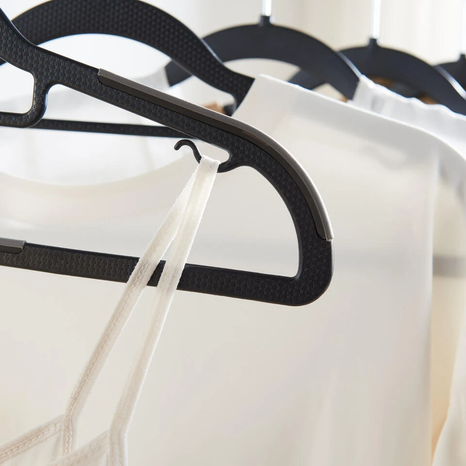 Heb je ook zoveel kleren? En kan je dus wel wat extra kledinghangers gebruiken? Kies dan voor deze zwart kunststof kledinghangers! De rubberen antislipstukken zorgen voor effectieve grip waardoor jouw kleren niet van de hangers kunnen afglijden. Super handig, toch? De kledinghangers zijn bovendien vrij dun waardoor ze weinig ruimte in beslag nemen. Ideaal voor als je nog wat extra kleren wil kopen…