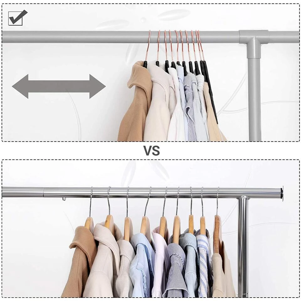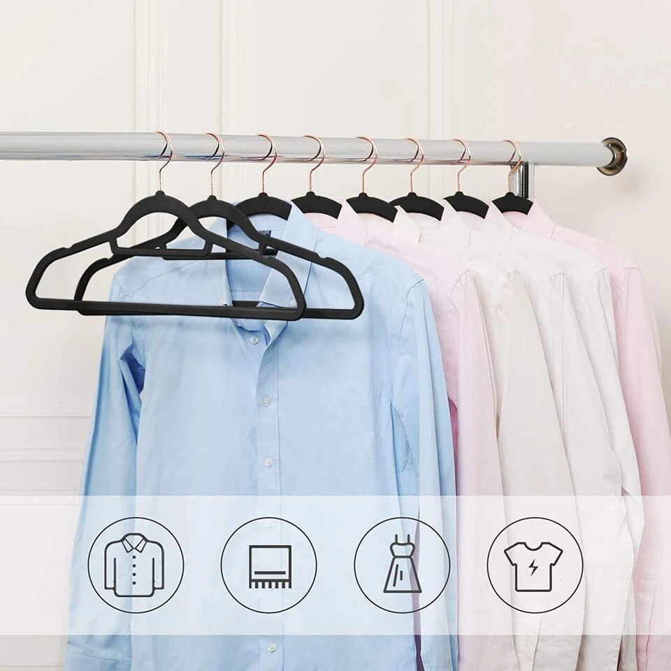 Wat je krijgt: 50 fluwelen kleerhangers met een 360° draaibare haak, zijdelingse inkepingen voor het ophangen van de bandtops, een middenstang voor sjaals of stropdassen en een dwarsstang voor broeken.