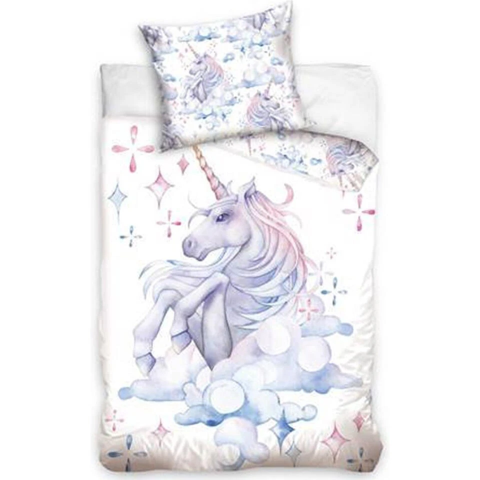 Animal Pictures dekbedovertrek, Unicorn. Waanzinnig mooi dekbedovertrek gemaakt van katoen met een afbeelding van een eenhoorn. Deze fijne set is een echte aanwinst voor elke slaapkamer in unicorn-thema. Een echte blikvanger door de mooie print in pasteltinten en de dubbelzijdige bedrukking. Hierdoor kan er gevarieerd worden met het opmaken van het bed. Een geweldig cadeau idee voor een verjaardag of de feestdagen voor een liefhebber van deze magische dieren.