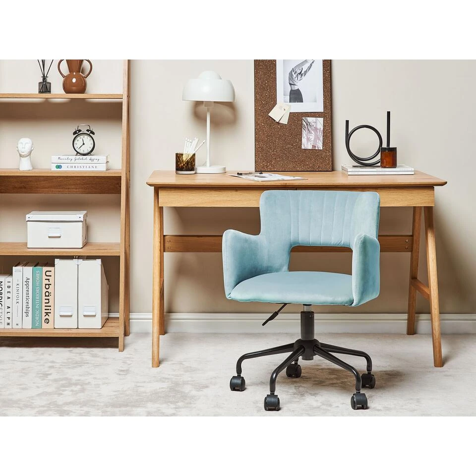 Stoel met fluwelen stoffering in mint. Deze bureaustoel heeft een prachtig modern ontwerp in combinatie met een retro sfeer en zorgt voor functionaliteit en comfort door de hoogwaardige materialen. De stoel heeft een dik gevulde zitting en armleuningen en rugleuning met opvallende details. De zachte fluwelen stoffering geeft diepte en kleur aan het geheel. De verticale tuft aan de binnenkant geeft de stoel ook nog een prachtig elegant gevoel.
