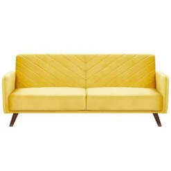 Velvet bank geel. Deze slaapbank past in elke woonkamer en past goed bij verschillende interieurstijlen, of het nu gaat om glamour, modern of mid-century. Het diagonale stikpatroon op de verstelbare rugleuning en de rubberhouten poten in donkere walnoottint geven de bank een Scandinavische uitstraling. Bekleed met zacht aanvoelende, fluwelen polyesterstof, ziet de bank er gezellig en uitnodigend uit. Dikke, met schuim beklede kussens zorgen voor het grootste comfort. Dankzij de slaapfunctie doet hij het ook perfect als logeerbed of als plek om een dutje te doen.
