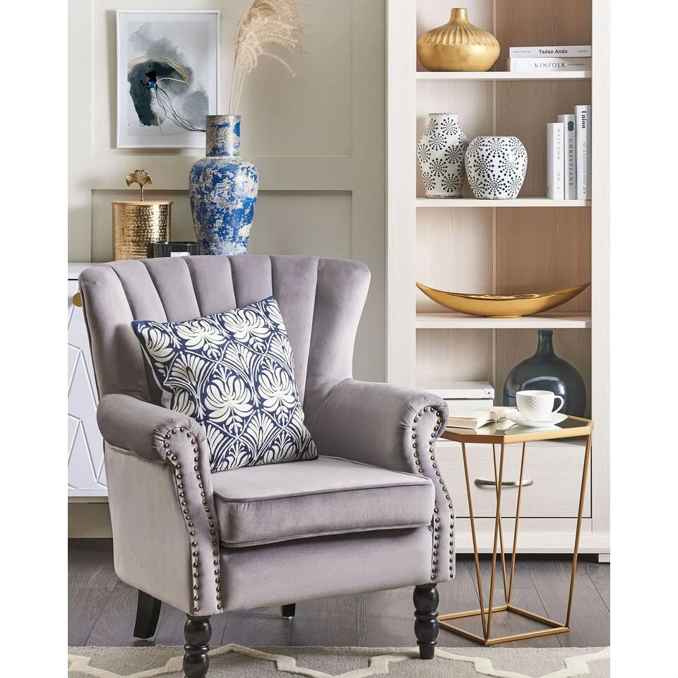 Grijs gestoffeerde fauteuil. Leun achterover en geniet van het moment in onze feel-good stoel. De twee voorste poten van rubberhout harmoniëren met de fluwelen zachte bekleding in grijs. Het hoogtepunt – de subtiele knopversiering op de armleuningen.