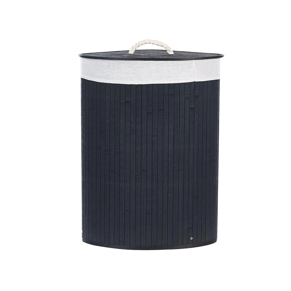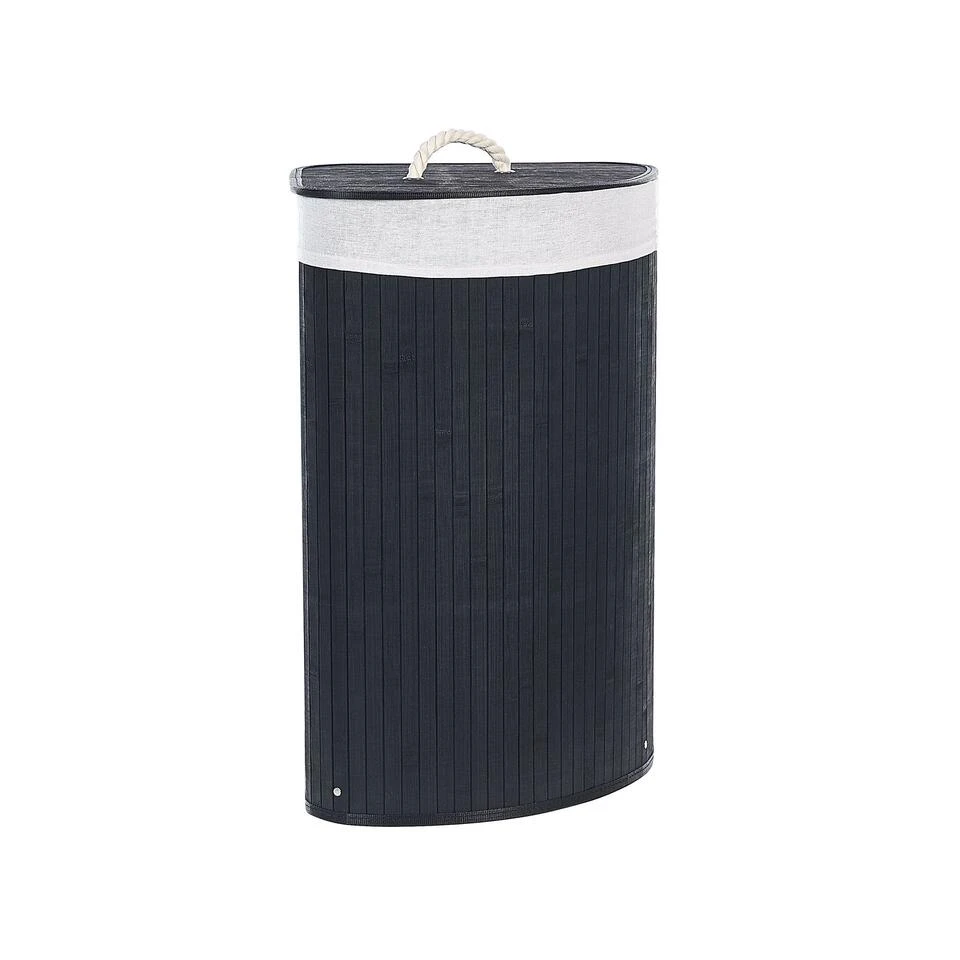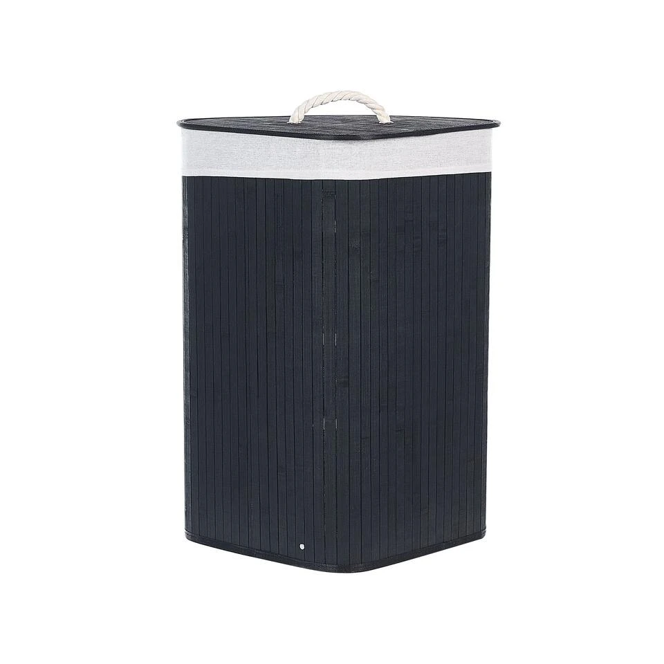 Wasmand met verwijderbaar deksel. Deze ruime mand zal een grote hulp zijn om je ruimte georganiseerd en opgeruimd te houden. Hij is gemaakt van natuurlijk bamboe, heeft een deksel met handvat en is gestoffeerd met een verwijderbare bijpassende stof. Dankzij zijn vorm past de mand in de hoek van een kamer zonder tegelijkertijd veel ruimte in te nemen. Het zal goed functioneren als wasmand en als opslag voor je accessoires.