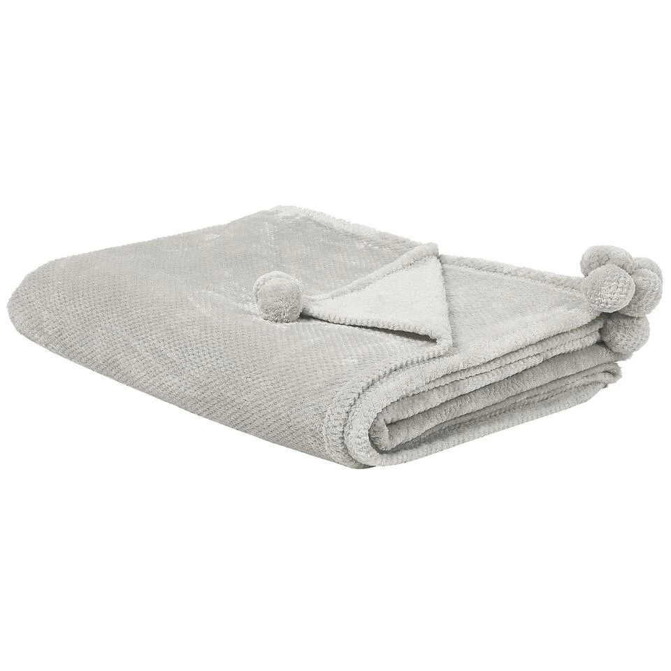 Fluffy, warm deken. Een warm deken van het beste materiaal voor gezellige momenten op de bank of op het terras. Het heeft pluizige, kleine pompons, is decoratief en veelzijdig te gebruiken.