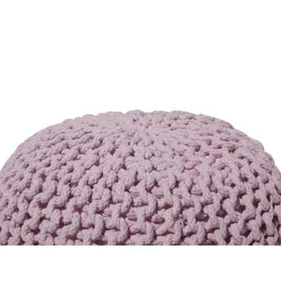 Roze ronde katoenen poef. Als je op zoek bent naar een vrolijk accent om je interieur op te vrolijken, dan is deze schattige gebreide ronde poef perfect. Met dik weefsel in een warme kleur en stevige, hoogwaardige vulling, kan het dienen als voetenbank, als basis voor een tafeltje of gewoon als decoratief stuk – de mogelijkheden zijn eindeloos. Wees creatief met het mixen van kleuren en maten om een ideale compositie voor je woonruimte te maken en geniet van de charmante moderne sfeer.