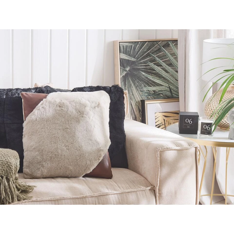 Pluizig sierkussen in een chique design. Een mix tussen modern en retro – het vierkante, beige sierkussen heeft een buitengewone uitstraling dankzij de twee hoeken in lederlook. Het is goed te combineren met diverse boho accessoires, past perfect bij houten meubelen en fluwelen banken en vormt een perfecte aanvulling op jouw interieur.
