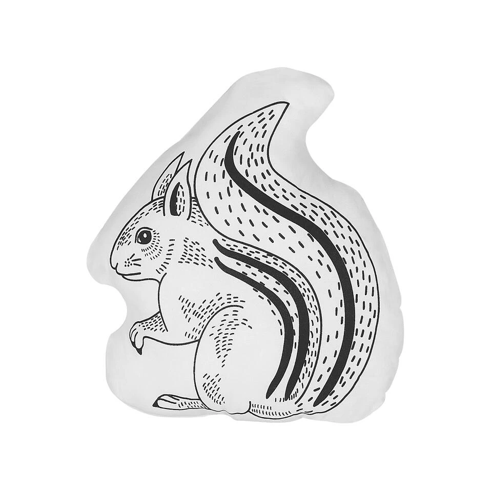 Wit en zwart sierkussen met eekhoornmotief. Dit schattige eekhoorntje is allesbehalve verlegen en zal zich prima thuisvoelen in jouw slaapkamer of kinderkamer. Het zwart-witte sierkussen van katoen met een polyester vulling in een trendy design is een ongecompliceerde en kwalitatieve mogelijkheid om je kamer net dat beetje extra te geven.