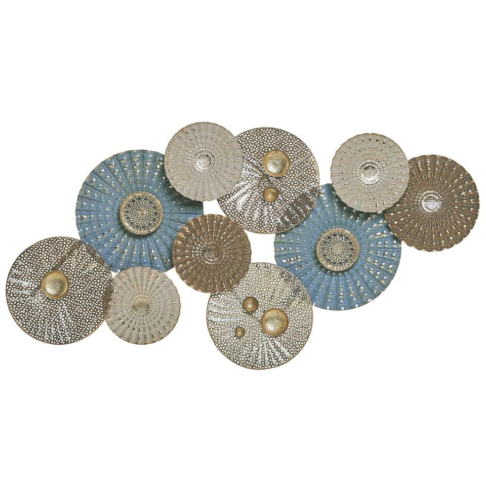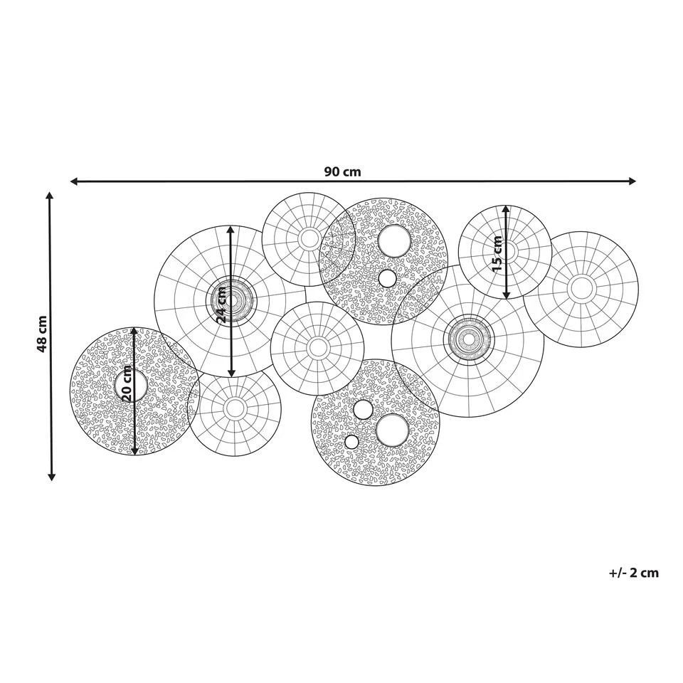 Wanddecoratie met metalen cirkels. Fleur jouw woonkamer op met dit fascinerende moderne wanddecor. De ronde metalen platen zijn onregelmatig gerangschikt in een buitengewone 3D-compositie. Dit zorgt voor een oosters gevoel in elk interieur. Door de ingebouwde haken kan het stuk horizontaal of verticaal worden opgehangen. Hang het boven een kast of bank en geniet van dit nieuwe opvallende decoratieve element bij jou thuis.