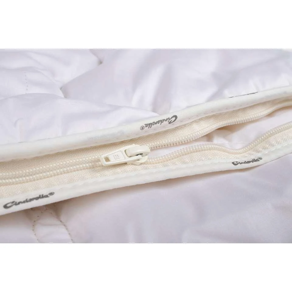 De tijk en de vulling zijn met een fantasiepatroon in de vorm van een wolk aan elkaar gestikt, zodat de vulling goed op zijn plaats blijft. Cinderella Lana 4 seizoenen bestaat uit twee delen en is daardoor geschikt voor alle seizoenen. Het dunne deel is voor de zomer, het dikkere deel is voor de lente of de herfst. Samengevoegd ontstaat een heerlijk dekbed voor de koude winternachten. De dekbeddelen zijn eenvoudig te koppelen met een ritssluiting.Cinderella Lana 4 seizoenen is een wat zwaarder dekbed. Heel fijn dus voor iedereen die graag wat gewicht voelt tijdens het inslapen en doorslapen.Het Cinderella Lana dekbed wordt in Nederland geproduceerd en geleverd in een handige bewaar- en/of reistas.