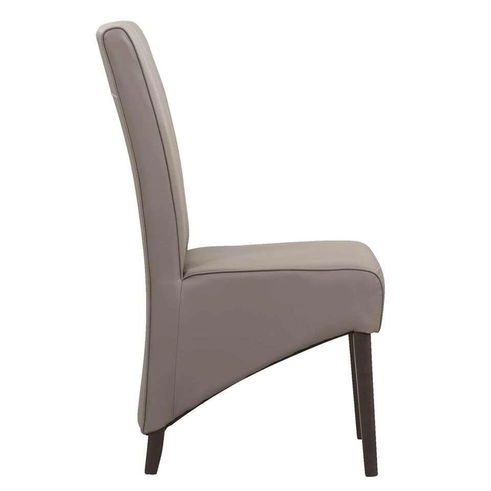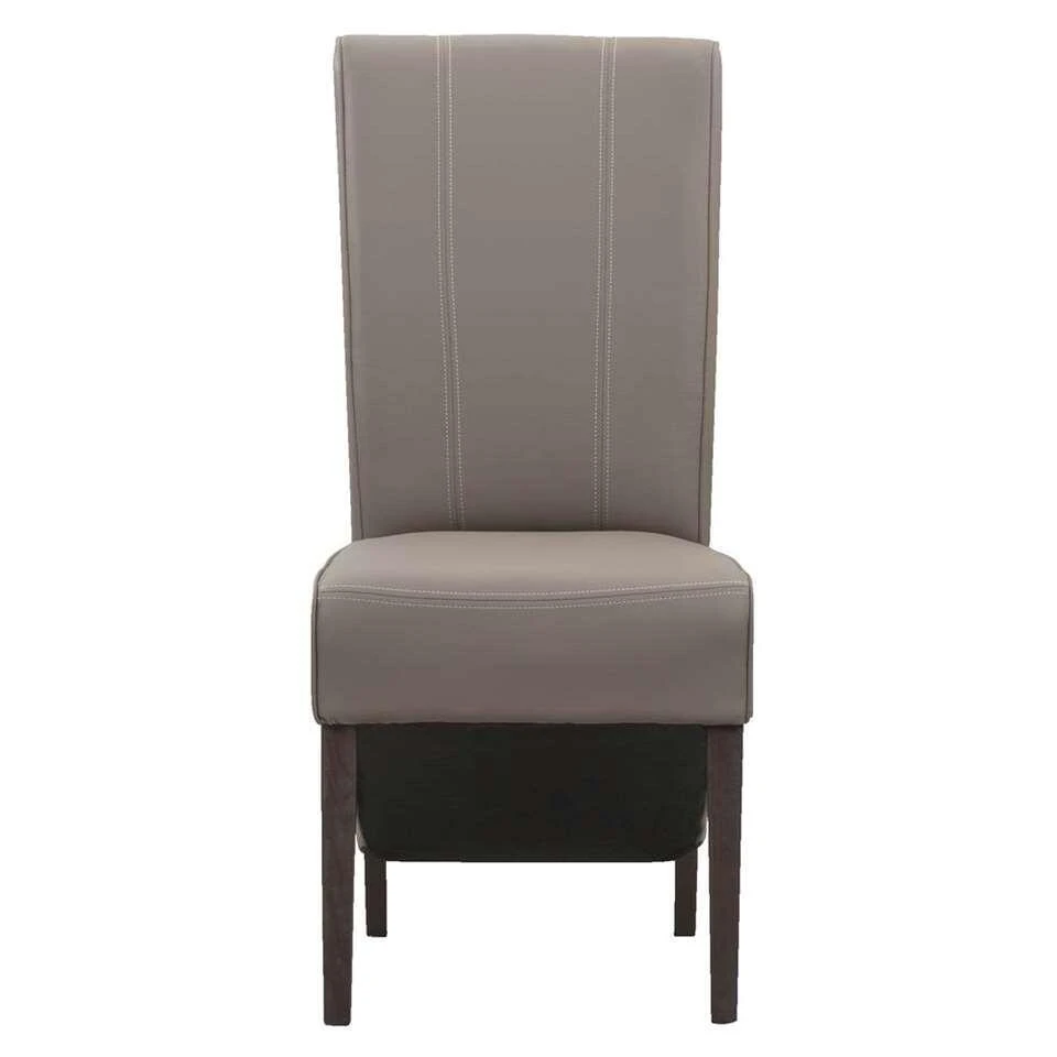 Eetkamerstoel Perry is een stoel met uitstraling! Deze eetkamerstoel is gestoffeerd met kunstleder in de kleur taupe. Dat geeft deze stoel een stoere look. Deze stoel heeft houten poten en een hoge rugleuning voor nog meer comfort. Deze stoel heeft geen armleggers en past daarom onder iedere tafel.