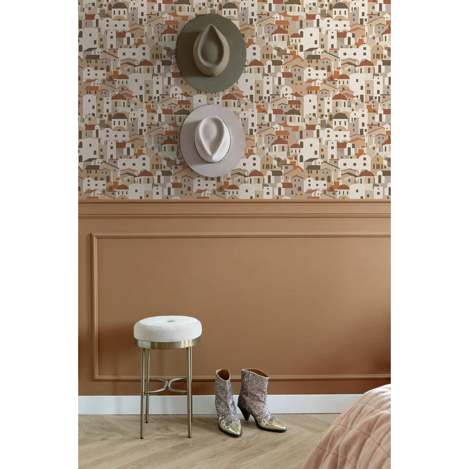 Je kunt dit behang niet alleen heel mooi combineren met lichte kleuren en materialen, maar ook met donkere, natuurlijke tinten en houtsoorten.