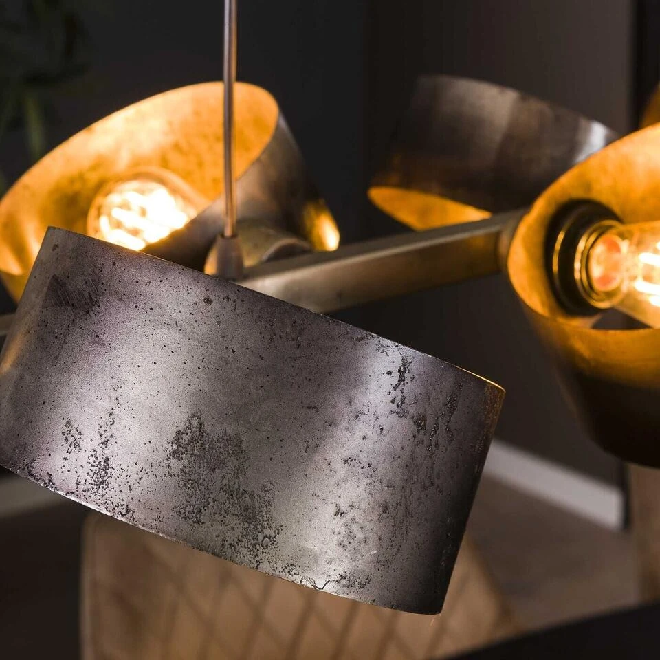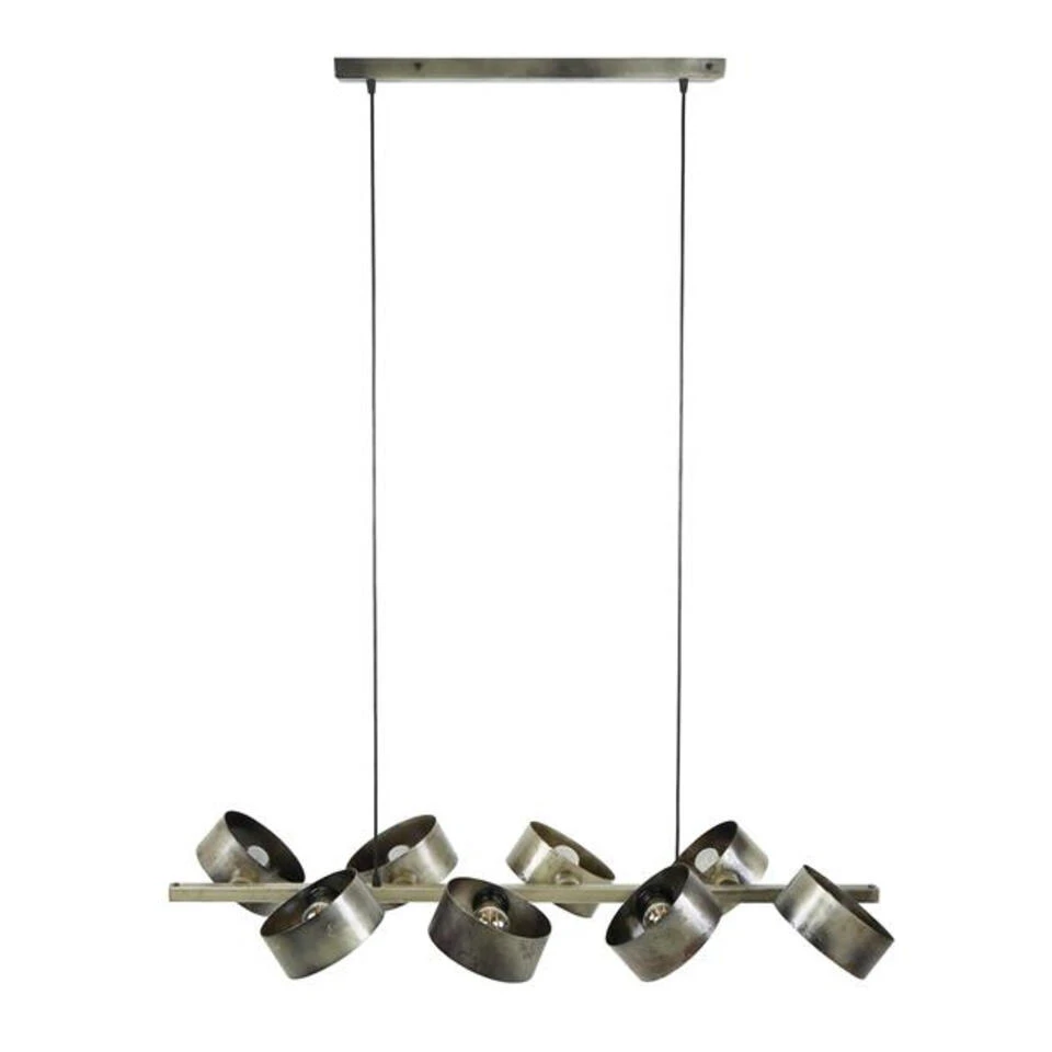 Deze hanglamp ‘rotar’ is gemaakt van metaal en is uitgevoerd in een oud zilver finish. De kapjes zijn draaibaar, waardoor deze op de gewenste manier geplaatst kan worden. Door het opengewerkte armatuur komt de lichtbron volledig tot haar recht. Deze lamp is tot 150 cm in hoogte verstelbaar. Er wordt aanbevolen LED lichtbron (8450) te gebruiken.