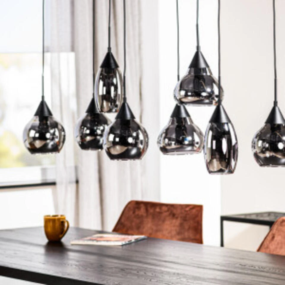 Deze trendy 8-lichts hanglamp is uitgevoerd met 8 verschillende glazen kapjes. Deze kunnen naar eigen inzicht op speelse wijze in hoogte versteld worden. Wij hebben deze hanglamp beschikbaar in diverse afmetingen. De lampenkappen zijn gemaakt van bruin glas. Het donkere smokey glas zorgt voor een sfeervolle ruimte.