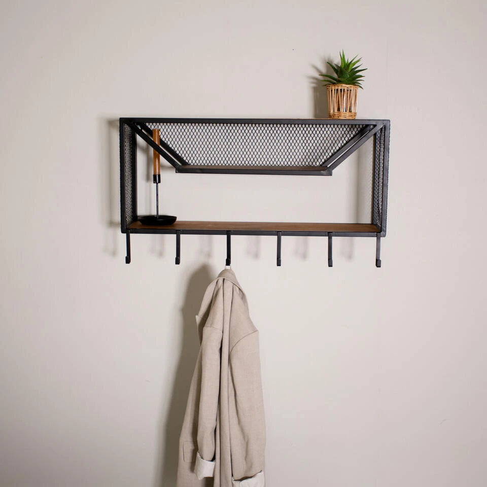 Wandrek Olivia is een stoer wandrek gemaakt van metaal en mangohout. Dit wandrek bevat maar liefst drie leggers en zes haken waardoor er voldoende opberg- en decoratieruimte gecreëerd is. De zijkanten van het industriële wandrek zijn afgewerkt met gaas. Het mangohout in combinatie met het gaas geeft dit trendy wandrek een stoer uiterlijk. Dankzij de gebruikte kleuren en materialen vindt wandrek Olivia een plek aan elke wand! Dit wandrek past uitstekend in de keuken, hal en woonkamer of juist op een kantoor!