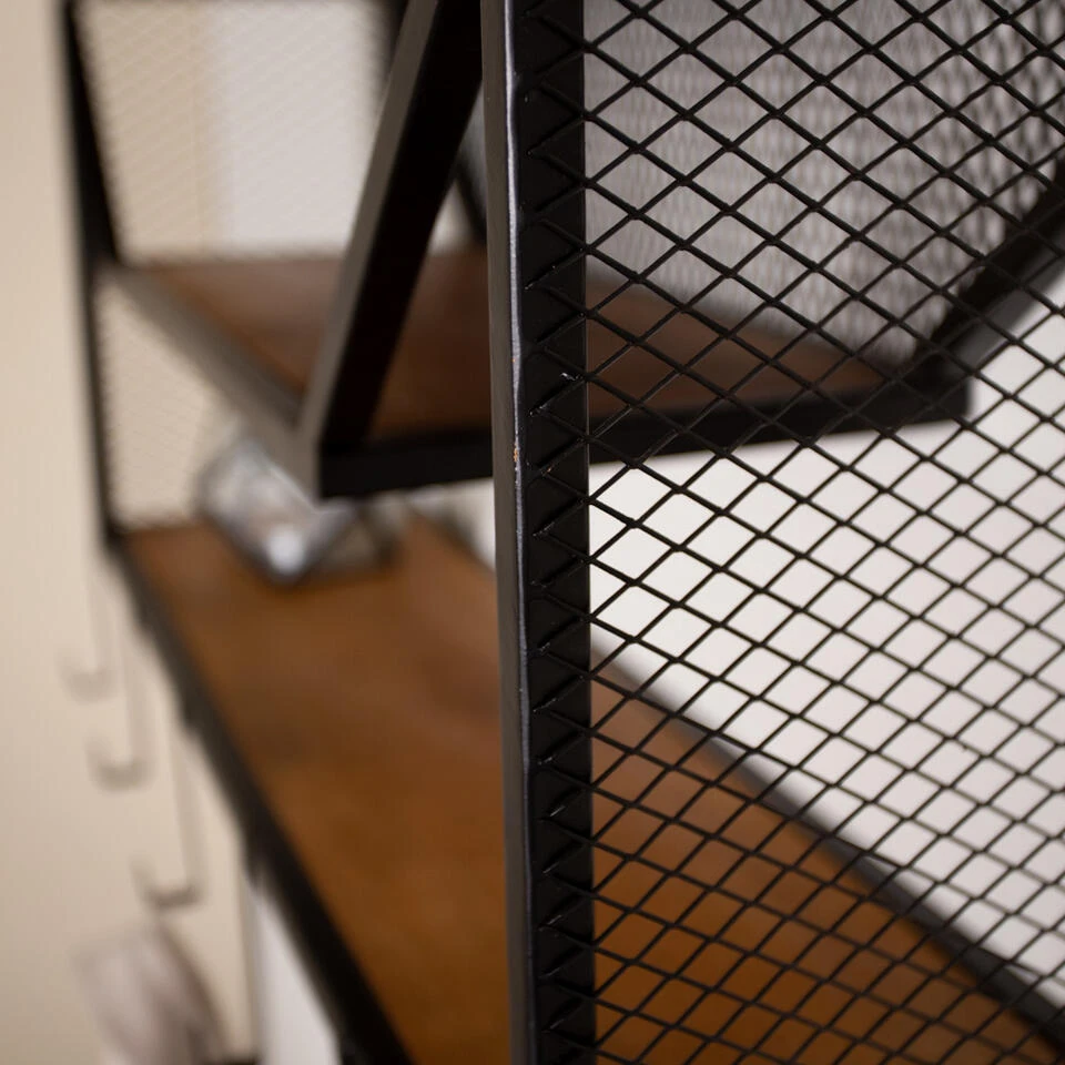 Het frame en het gaas rondom het wandrek zijn gemaakt van zwart gepoedercoat metaal. De zwarte kleur in combinatie met het mangohout past erg goed bij de hedendaagse interieurtrends en geeft het wandrek een stoere en industriële uitstraling.