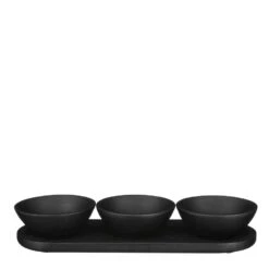 De Tomar schaaltjes met dienblad komen uit de collectie van Mica Decorations en zijn ideaal om hapjes te serveren. De schaaltjes zijn gemaakt van FSC®-gecertificeerd mangohout in een mooie, zwarte kleur. De schaaltjes worden verkocht als set, drie kleine schaaltjes en een ovaal dienblad. De schaaltjes zijn erg leuk om tapas hapjes te serveren! De afmetingen zijn L35 x B12 x H5 cm. De inhoud is 200 ml per schaaltje.