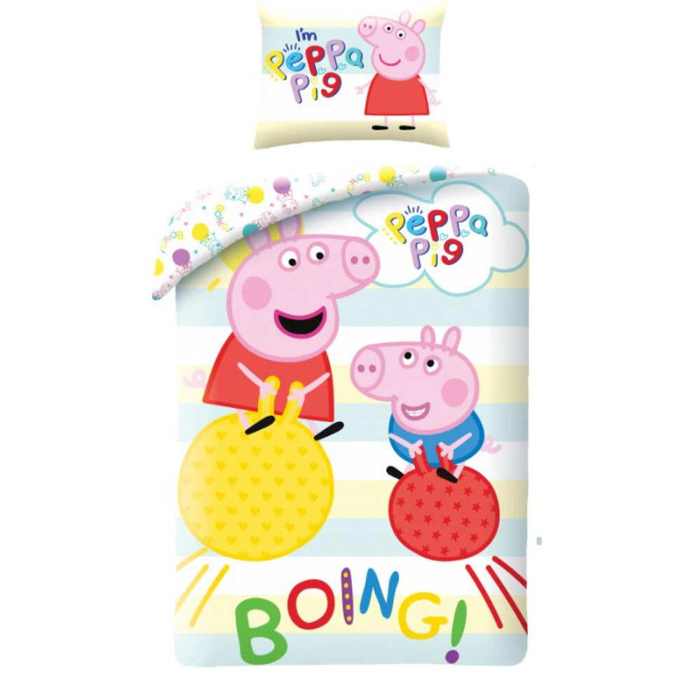 Peppa Pig Dekbedovertrek, Boing. Peppa en haar broertje George hebben de grootste lol met hun skippy-bal! Doe jij met ze mee? Dit vrolijke katoenen dekbedovertrek is een leuke aanwinst voor de kinderkamer. De leuke kleuren, de dubbelzijdige functie van het overtrek en de extra grote kussensloop zorgen ervoor dat er gespeeld kan worden met de opmaak van het bed. Kortom; een echte blikvanger en een geweldig cadeau idee voor een verjaardag of de feestdagen. Wordt geleverd in een leuk bijpassend katoenen tasje.