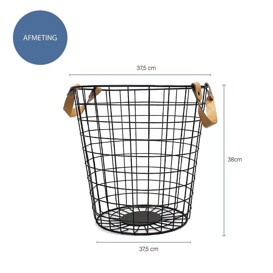 De opbergmanden hebben een ronde vorm en zijn gemaakt van draadstaal,waardoor je er mooi doorheen kunt kijken. Deze mand heeft een lengte en een diameter van 38 cm en een hoogte van 37,5 cm. De mand is ook in een kleinere variant te verkrijgen met de volgende afmetingen 32 x 32 x 33 cm (lxbxh).