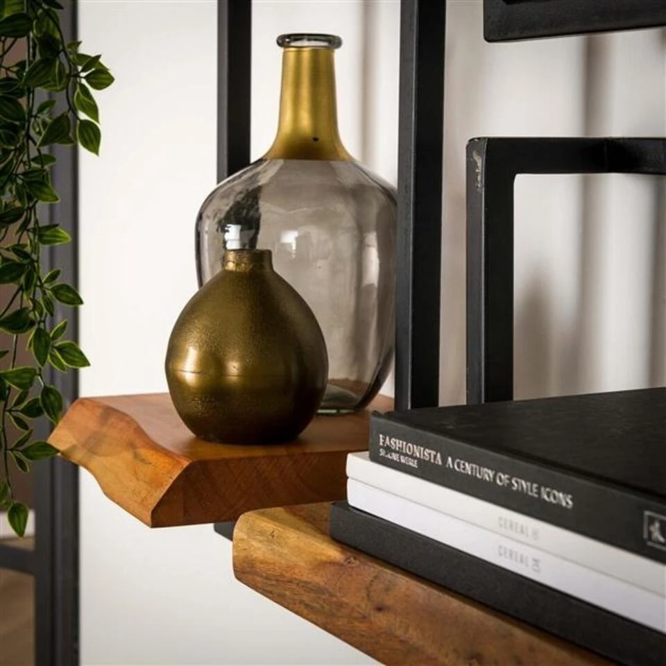 Het robuuste frame is van donkergrijs gepoedercoat metaal met een vintage look. De originele oneffenheden zijn nog zichtbaar op het oppervlak. Deze vintage look houdt in dat er onregelmatigheden in de kleur van het frame kunnen voorkomen. In combinatie met het hout, past het metaal erg goed bij de hedendaagse interieurtrends en geeft het rek zijn stoere en industriële uitstraling.