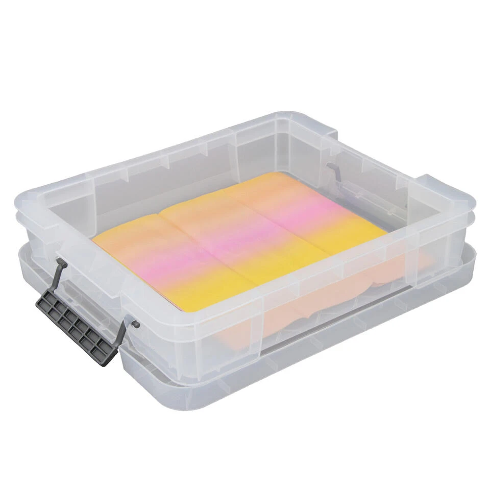 Allstore opbergbox. Deze transparante stapelbare opbergbox/doos is ideaal om allerlei producten geordend maar ook vocht- en stofvrij op te bergen. De box is voorzien van 2 clipsluitingen. Materiaal: polypropyleen. Afmeting: ca. 43 x 36 x 8 cm. Inhoud: ca. 9 liter.
